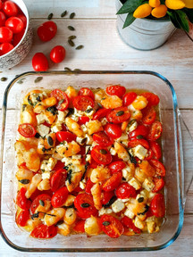 Crevettes à l'ail, feta et tomates cerises