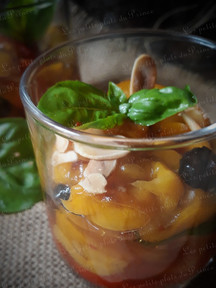 Verrine de poivrons grillés en salade, amandes grillées, olives et basilic